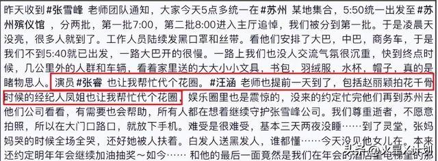 演员张睿、赵丽颖的前经纪人也送来了花篮,歌手薛之谦因演出无法到场,特意发文悼念,称“会一直记得张老师说过的话”。